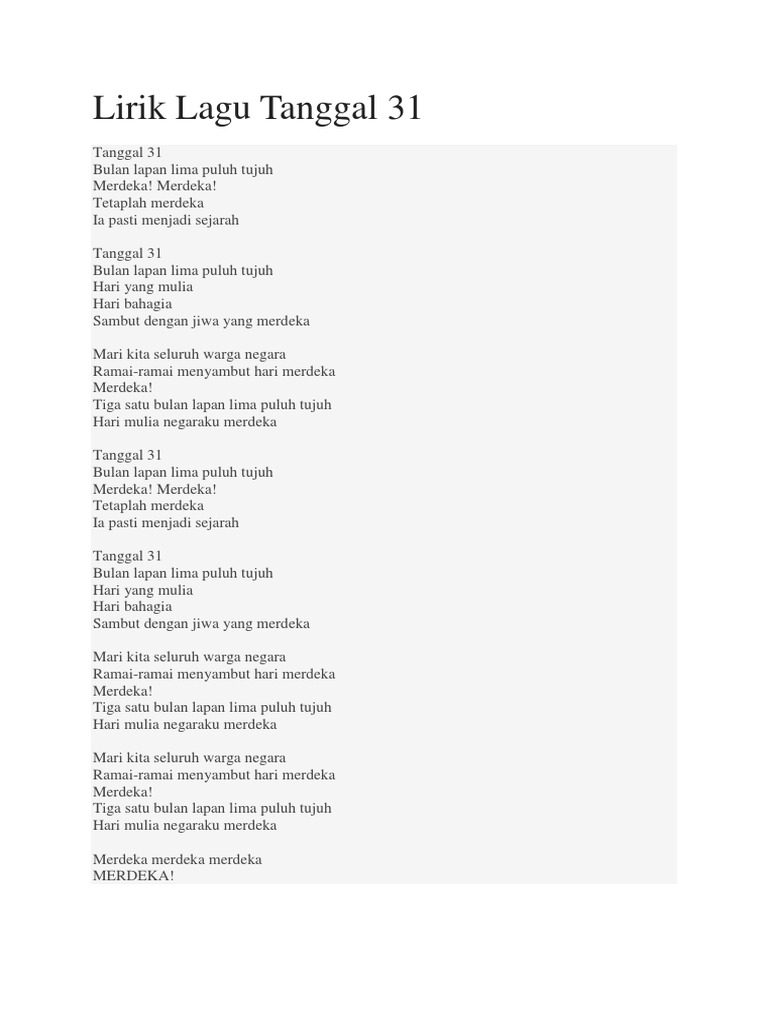Ia pasti menjadi sejarah. Lirik lagu Sudirman - Tanggal 31 Ogos Tanggal tiga puluh satu bulan lapan lima puluh tujuh merdeka merdeka tetaplah merdeka ia pasti menjadi sejarah. Lirik Lagu Tanggal 31 Lirik Lagu Tanggal 31 Lirik Lagu Tanggal 31 Tanggal 31 Bulan Lapan Lima Puluh Tujuh Merdeka Merdeka Tetaplah Merdeka Ia.